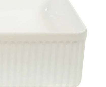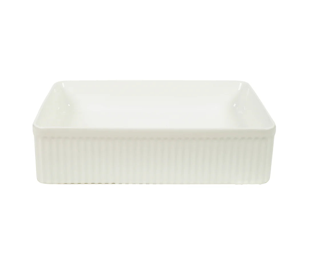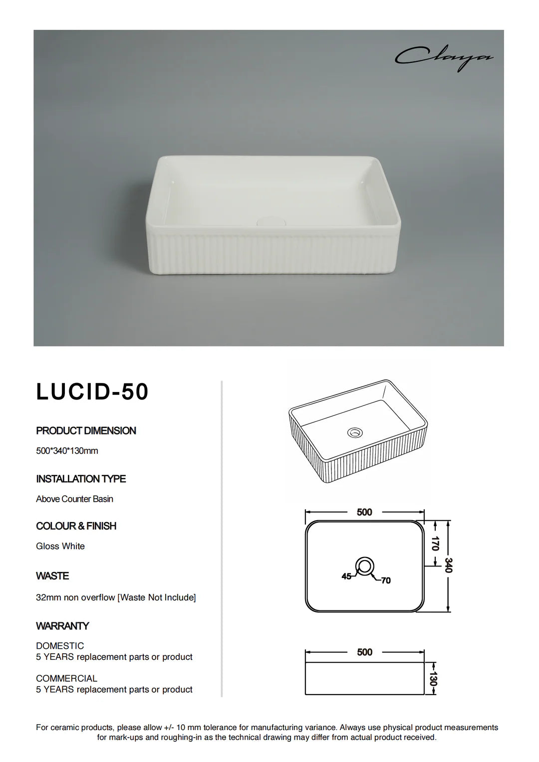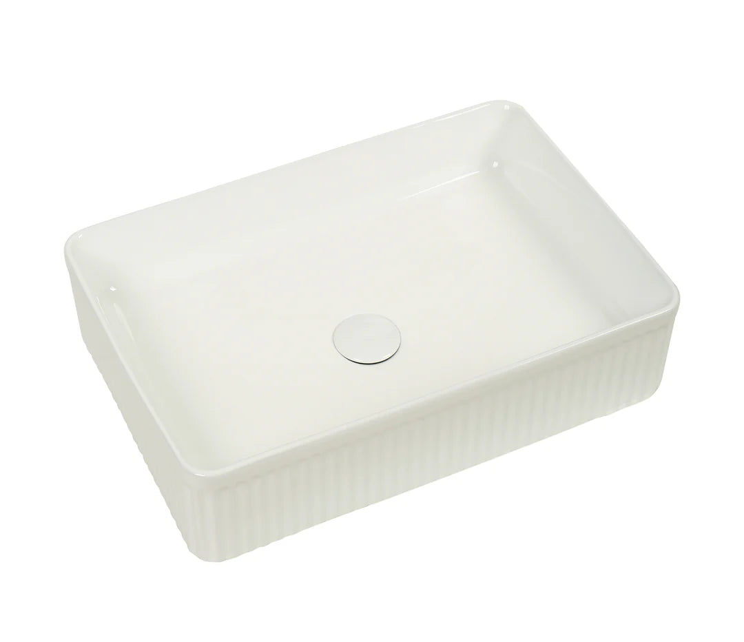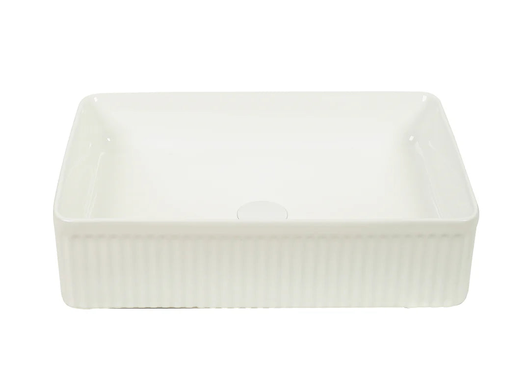 The Lucid-50 is a 500mm rectangular above-counter ceramic basin, designed with a refined slim-edge profile and vertical fluted exterior. Its crisp geometry is softened by a high-gloss white glaze, offering a perfect balance between bold structure and understated texture.